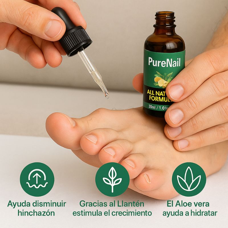 Con ingredientes naturales como aloe vera, sangre de drago, matico, etc, PureNail combate los hongos en tus uñas, restaurando su salud, brillo y fortaleza.